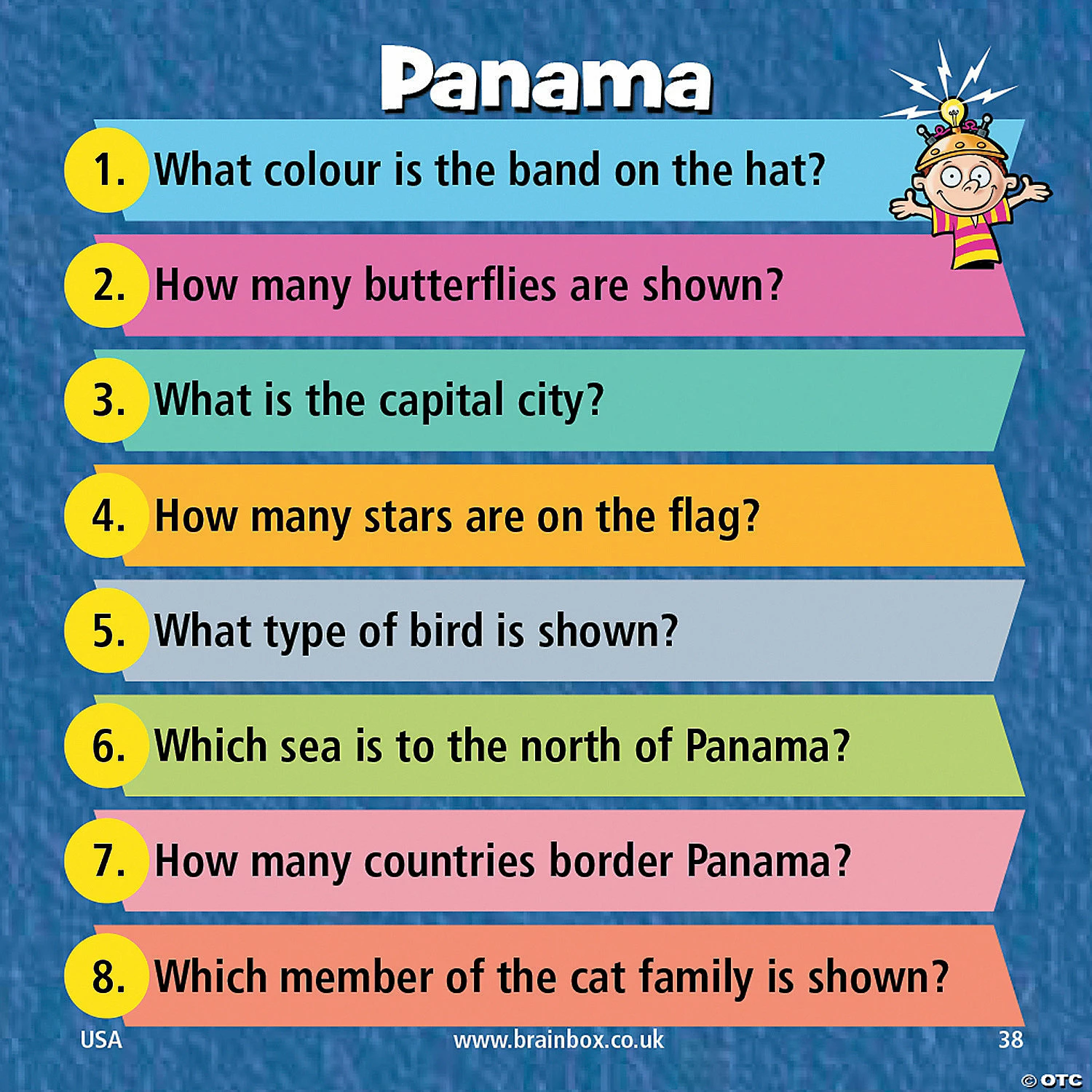 Test your knowledge of famous landmarks, world cultures, geography and more with this fun, memory-boosting game. Players study the pictures-and-facts side of the card for 10 seconds, and then flip to the other side to see how many questions they can answer: Which sea borders Venezuela? Which country borders Bangladesh to the west? Includes 55 sturdy cards, a timer and a die. For 1 or more players. Download Instructions