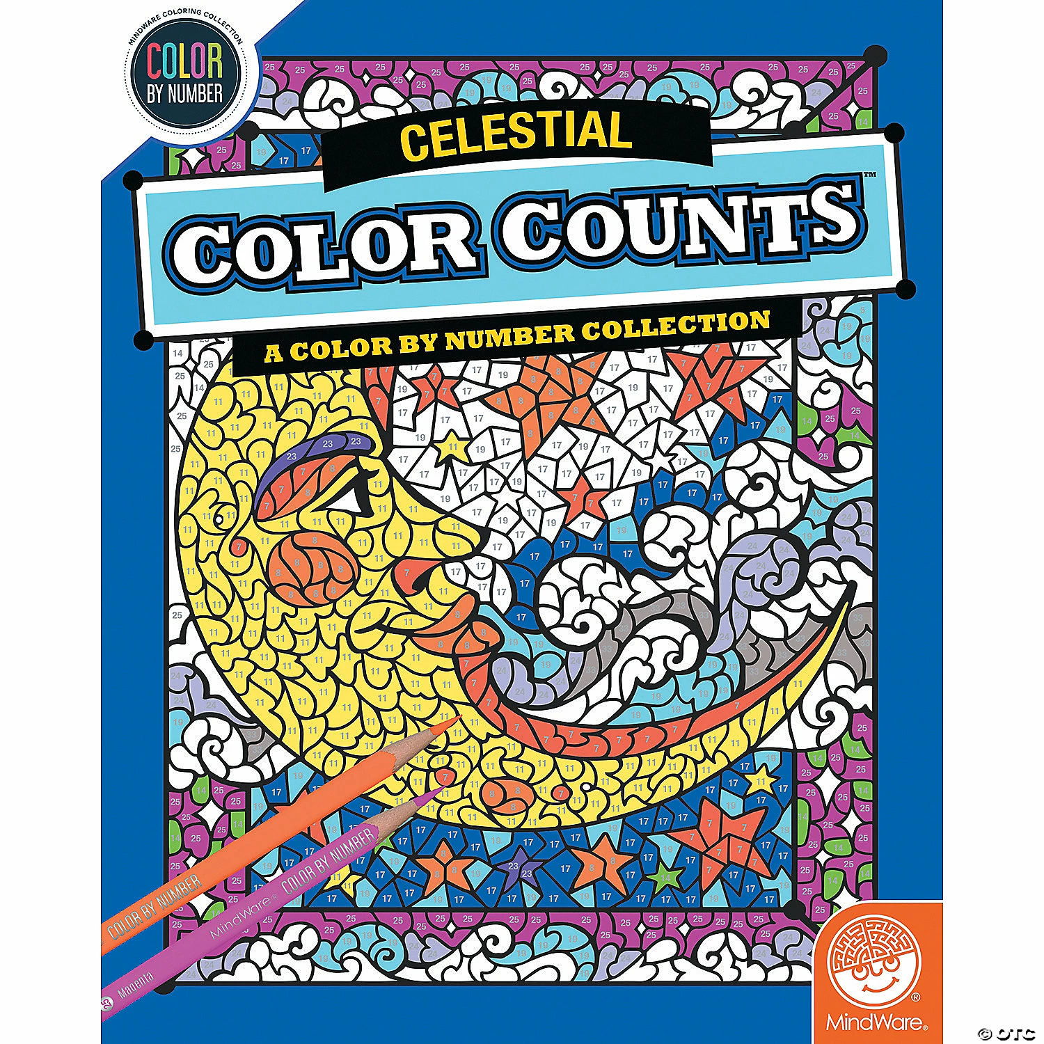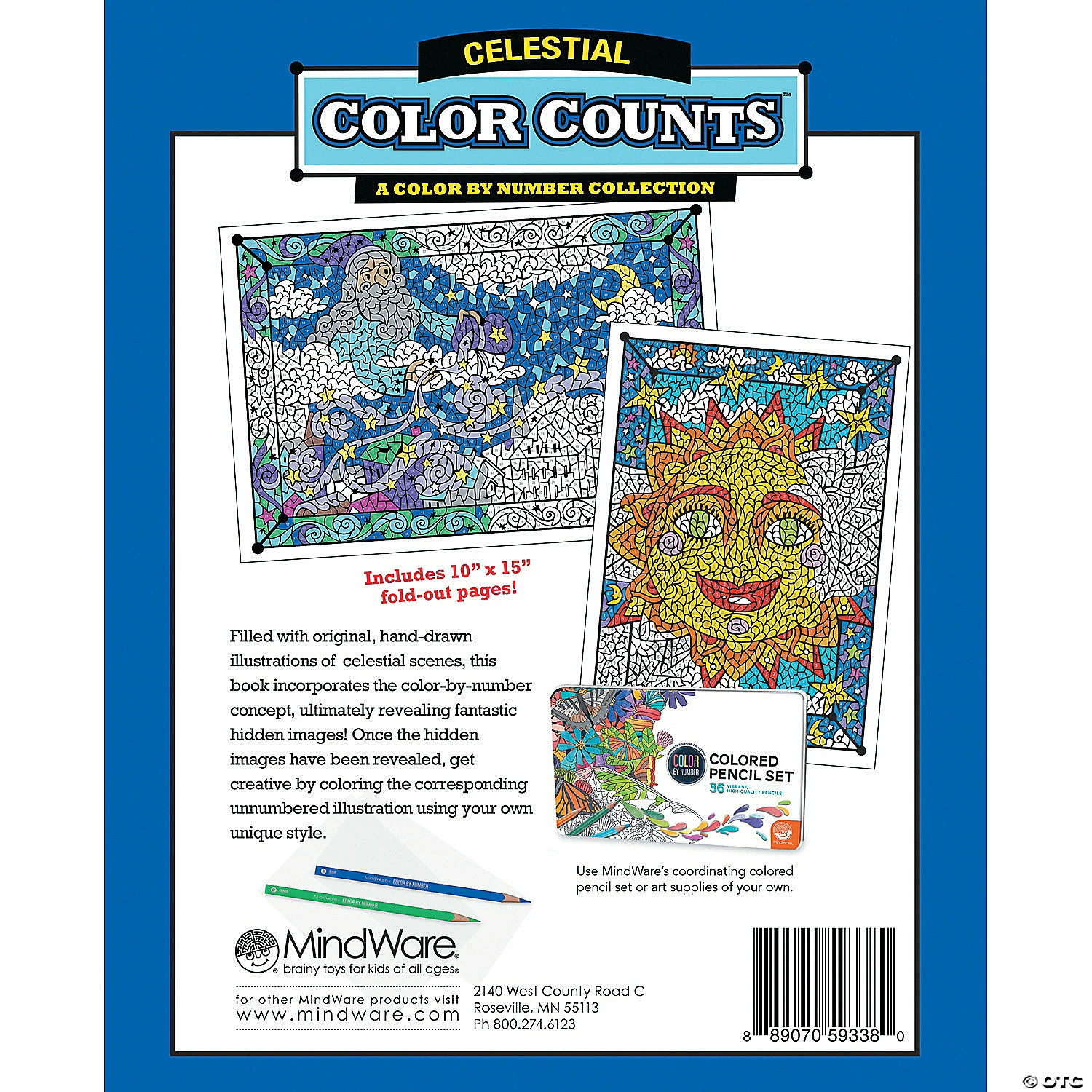 This new Color Counts coloring book incorporates a universal numbering system that pairs perfectly with our brilliantly-hued, 36-count Colored Pencil Set. Printed with coordinating numbers, the book and pencils are designed to make your coloring experience even more relaxing and enjoyable. Original, hand-drawn illustrations of heavenly celestial scenes will reveal fantastic hidden details as you color. Once you’ve completed the numbered designs, try the un-numbered version of the illustration to add your own unique style. Each design, printed on artist-quality paper, creates a frame-worthy finished product! Includes 22 perforated pages including 8 fold-out pages that extend to a 10″ x 15″ size. Download Sample Page