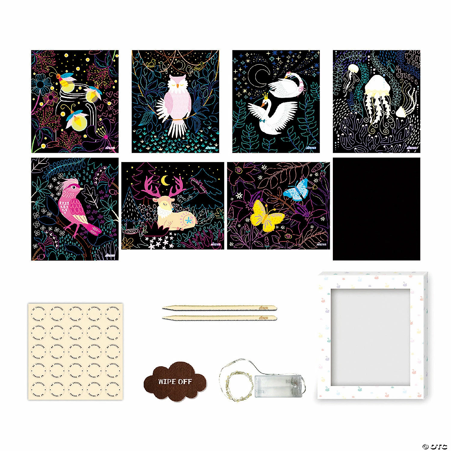 Create a hand-designed light box with 8 different scratch art projects! Follow the outlines or get creative in this scratch art kit that makes a memorable gift. Once your project is complete, insert it into the illuminated box for unique DIY artwork to display! Includes gorgeous fairy lights to back light your scratch creation. There are 7 designs to choose from – swans, owls, birds, butterflies, a deer, jellyfish, fireflies plus a blank one for your own ideas.• Scratch art designs measure 8.7″ x 10.2″• Includes 8 scratch sheets, sticker sheet, 2 wooden pens, wipe of cloth, light bar, and 1 photo frame• Requires 2 AA batteries (not included)