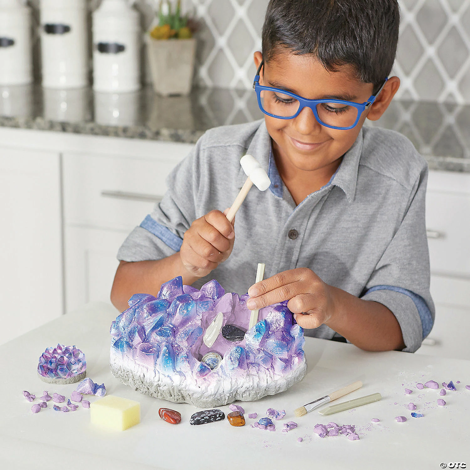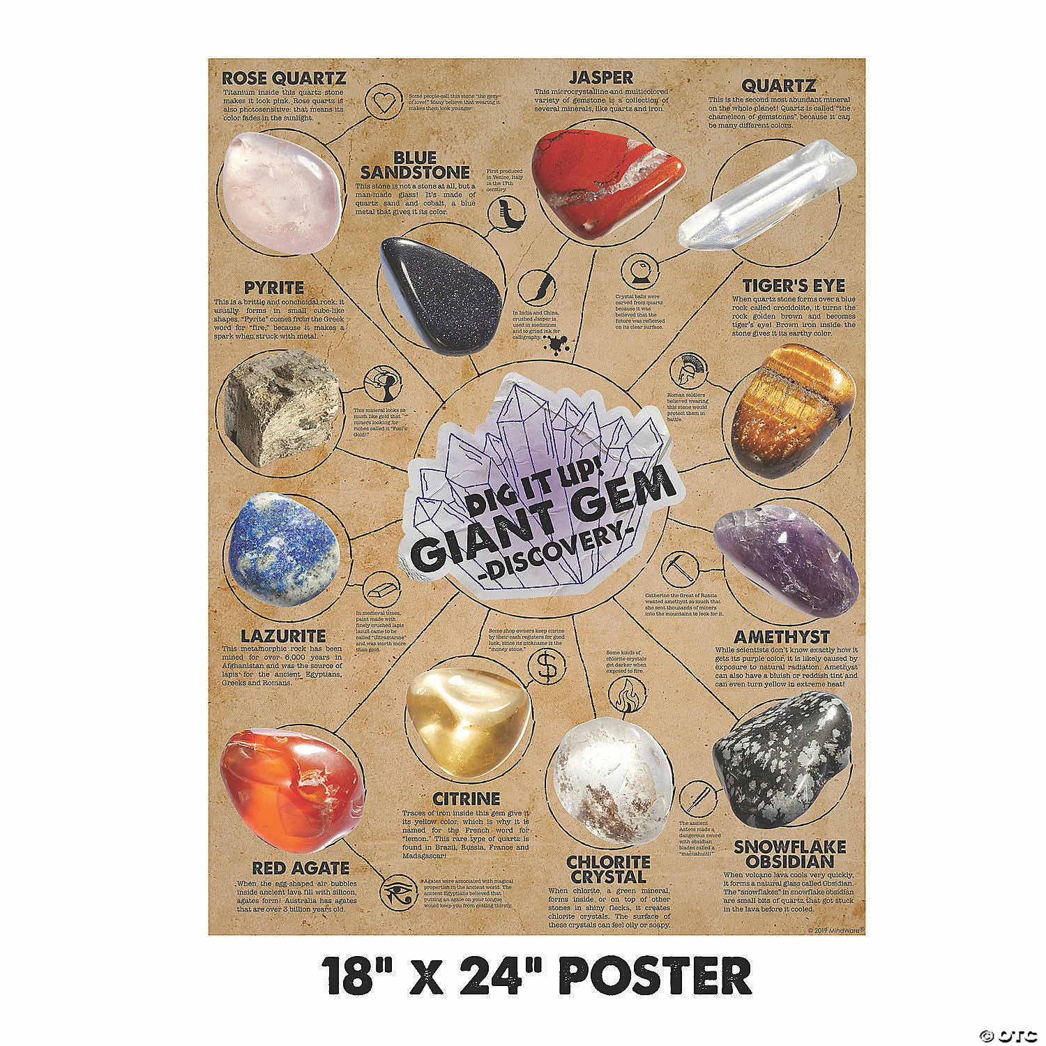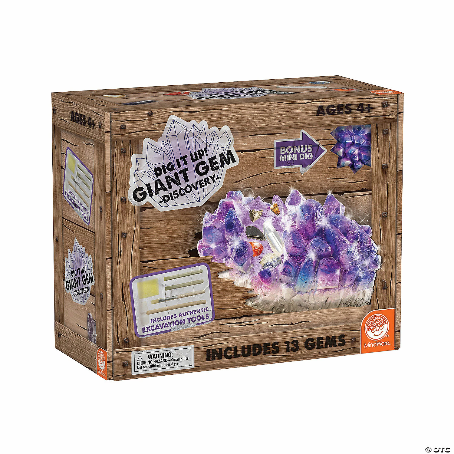 Delve into mystery of what treasures rest deep inside the earth as you uncover the 12 genuine gemstones inside this giant piece of geode! Uncover stones like jasper, amethyst and tiger’s eye, then use the gem identification poster learn more about each one, complete with scientific, historical and mythological facts! Just soak the gem in a bowl or sink, chip away with your chisels, and discover! • Giant Gem contains 12 different gemstones to discover inside, plus one bonus mini dig!• Helps promote an early interest in science and geology for kids• 2 chisels allow you to dig with a friend! • Includes a 7” by 4” Giant Gem, a mini geode gem dig, 12 different gemstones, 2 chiseling tools, gem poster and instructions