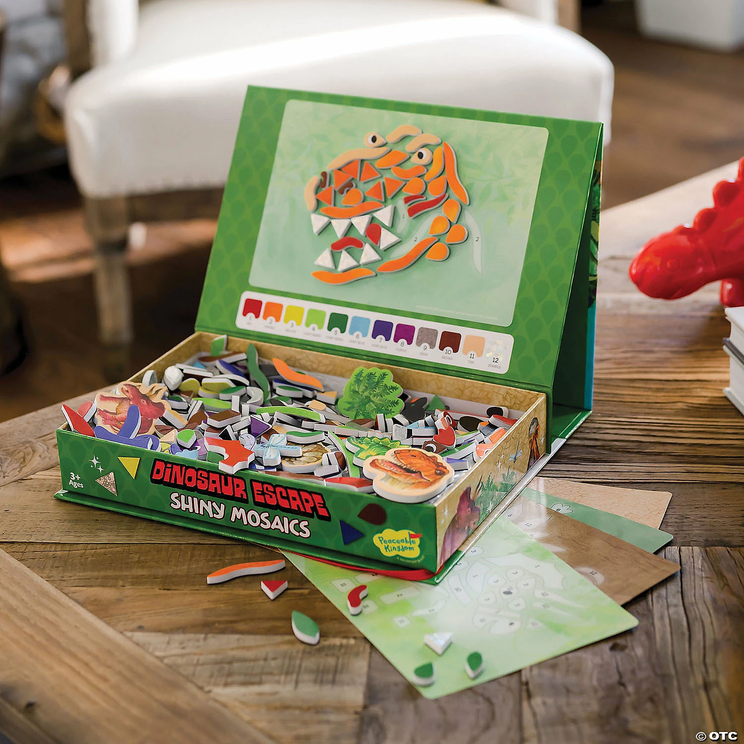 Escape into exciting imaginative play. Featuring numbered patterns, bright colors and thick magnetic pieces that are easy for small fingers to move into place, children can follow the color guides to reveal dinosaur characters or use the blank backgrounds to create their own prehistoric friends. Great for at home, in the classroom or on the go, the magnetic shapes of Dinosaur Escape Shiny Mosaics come inside a sturdy travel case with a pop-up play surface.• Develops color matching and fine motor skills• Great for classroom, home or on-the-go play• Includes 10 patterns, 2 create-your-own-mosaic backgrounds, over 300 magnetic shapes, travel case and pop-up easel play surface.