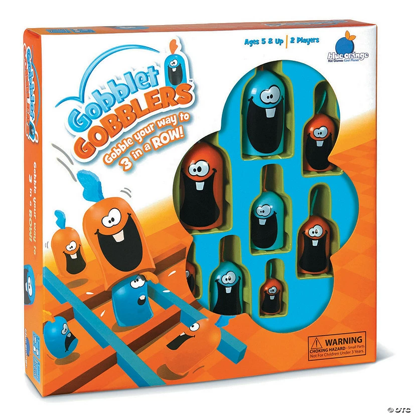 Test your memory and appetite for laughs with this easy to learn and quick game of strategy. Cartoonish wooden characters bring pizzazz to this Tic-Tac-Toe style game. Just line up three of your Gobblers in a row to win. But watch out! These Gobblers are hungry for fun…and other Gobblers. Awash in cheerful colors, this wooden board game is made to be treasured. Gobblet Gobblers is the best first strategy game for kids to challenge their parents. For 2 players ages 5 and up. Contents: 1 Grid, 12 Gobblers, and Illustrated Rules.