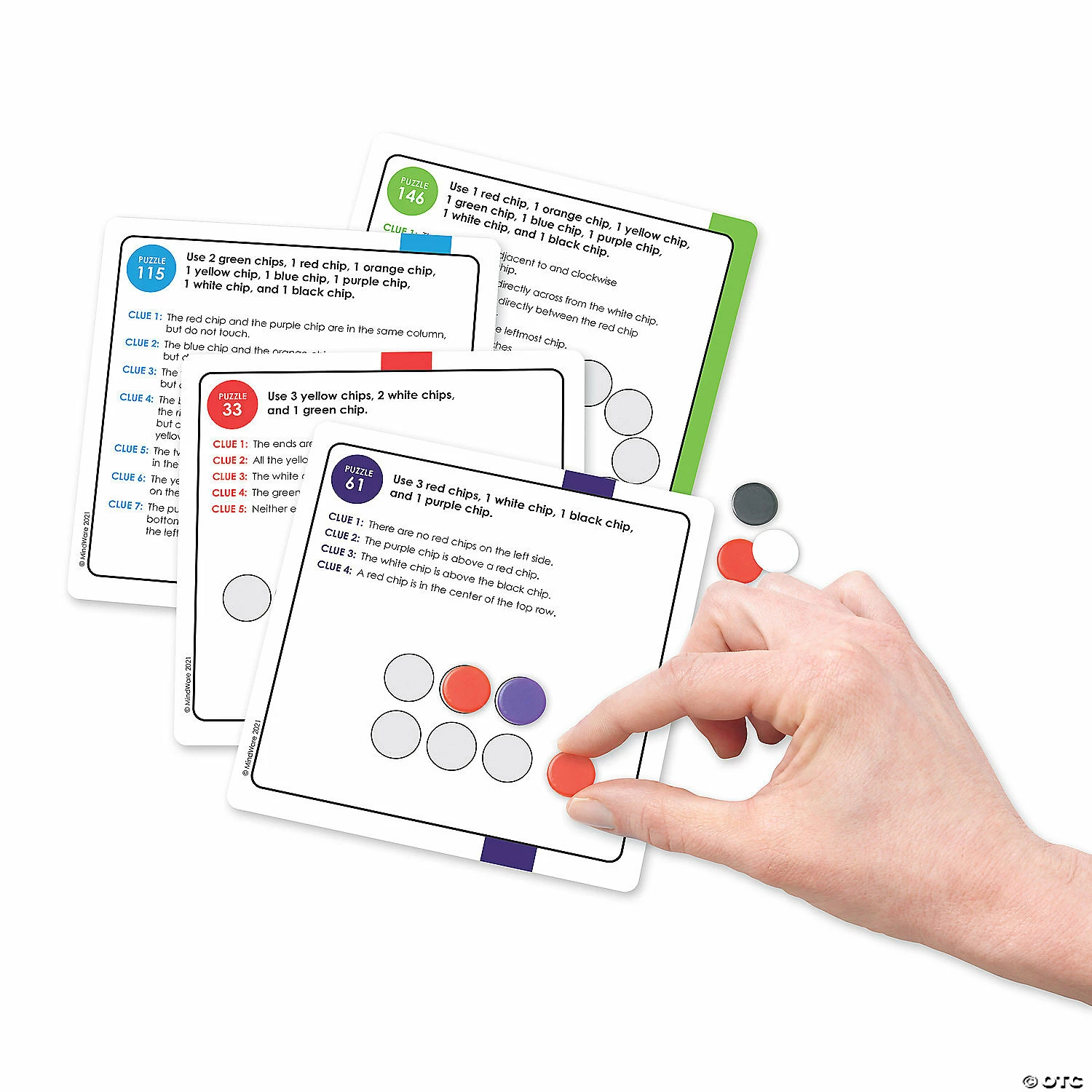 Each Logic Links puzzle uses a series of clues to instruct a player where to place colored chips to solve the puzzle, requiring deductive reasoning–and determination! Logic Links Puzzle Box includes 166 puzzles and 32 plastic game chips. Download Instructions