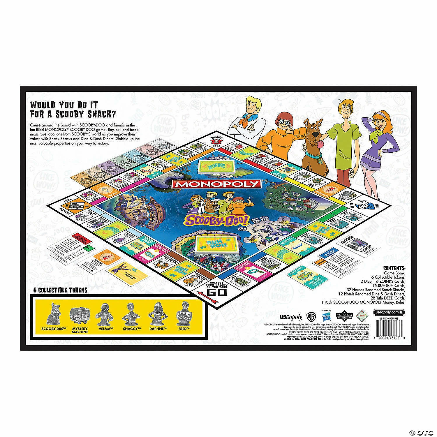 MONOPOLY®: Scooby-Doo. Join Scooby-Doo and the gang as you buy, sell and trade monstrous locations from Scooby’s world. Adventure through 22 suspicious locations in this commemorative version of Monopoly celebrating 50 years of the mystery-solving animated series! For 2-6 players, ages 8+.What’s Included:• Game board featuring monstrous locations• 6 Custom tokens: Scooby-Doo™, Velma™, Shaggy™, Daphne™, Fred™ and Mystery Machine• Houses and hotels renamed Snack Shacks and Dine & Dash Diners• Community Chest & Chance cards renamed Ruh-Roh and Zoinks!• Custom Scooby-Doo money• Rules Special Shipping Information: This item ships separately from other items in your order. This item cannot ship to a P.O. Box. This item may be subject to additional processing days. ITEM IS NOT ELIGIBLE FOR EXPEDITED SHIPPING