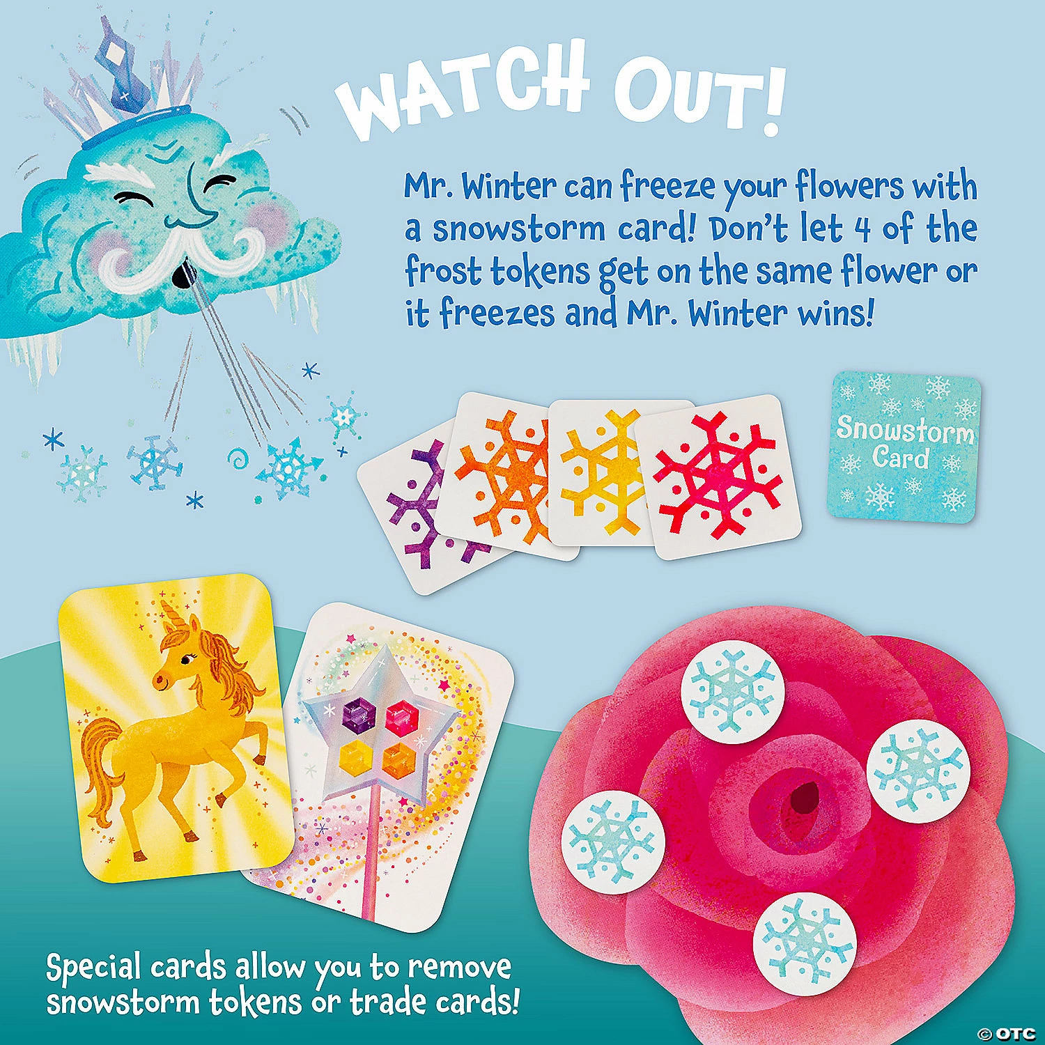 Mr. Winter is trying to freeze over the fairies’ treasured flowers! Players match Fairy Cards to gather the hidden Magic Gems before 4 snowflakes land on one flower. Special cards allow players to slow down Mr. Winter’s chill. Work together to fill the fairies’ magic wand and banish Mr. Winter from the garden!Kids work together to banish Mr. Winter from their beloved garden! Different card combinations keep the game fun and interesting. INCLUDES: Game board, 4 jewel tokens, 13 snowflake tokens, 44 snowstorm cards and 57 fairy garden cards.