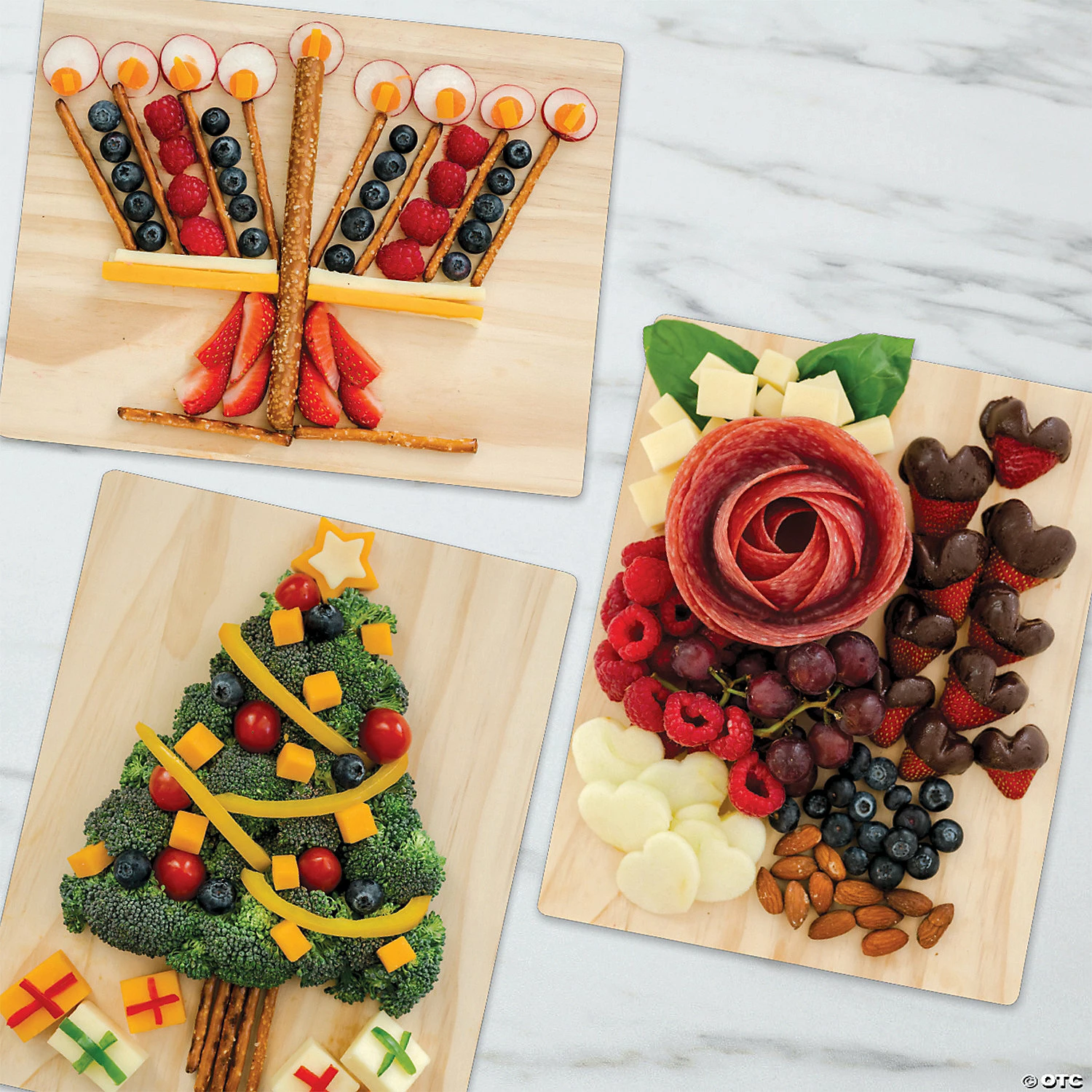 This kit has everything chefs-in-training need to get in on the fun charcuterie trend, including 3 kid-safe knives that slice through foods while sparing little fingers, 25 kid-sized utensils, full-color recipe cards and a pamphlet to give ideas for fun holiday-themed trays. Use the wooden charcuterie board, shaped cutters and more to create adorable, delicious charcuterie boards for any occasion. Young chefs will delight in trying these new and favorite foods they’ve prepared themselves with kid-tested recipes!25 Piece Deluxe Set Includes:• 10″ X 8″ Wooden charcuterie board and 10″ x 7″ Cutting board• 3 Safety knives in 4.75″, 5.75″, and 6.75″ lengths• 2 Heart cutters sized 2.5″ and 1.5″• 2 Star cutters sized 2.5″ and 1.5″• 2 Flower cutters sized 2.5″ and 1.5″• Serving tongs and non-slip tongs• Tablespoon measuring spoon• Dip bowl• 10 Star food picks• 3 Double-sided recipe cards• Holiday idea bookKid-Friendly Tools: Safety knives are optimized for functionality. The plastic blades are engineered to cut through hard foods like carrots and apples without any danger to hands or fingers. Fun shaped cutters help encourage kids to try new foods and are a quick and easy way to dress up your charcuterie boards.Oversized Recipe Cards: Kid-tested dips and fun charcuterie board recipes will keep your young chef engaged. The oversized recipe cards provide clear inspiration pictures, fun facts about food, useful information about kitchen tools and more! Holiday Ideas: The full color Holiday Supplement provides inspiration for six celebrations!