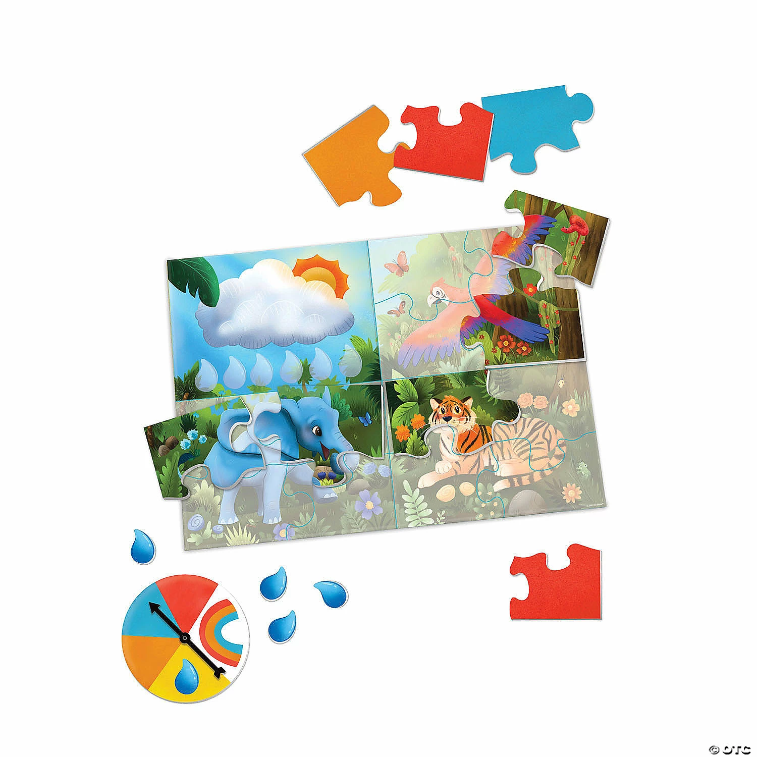 Raindrop Forest is a rain or shine puzzle game that includes three adorable puzzles as part of the game. Players work together to spin and add puzzle pieces to the board. Put the forest animal puzzles together before the rain comes and everyone wins!• Includes 1 game board, 3 four-piece puzzles, 6 raindrops, 1 spinner• Kids learn color matching, visual-spatial awareness, fine-motor skills and cooperation• 2 to 4 players