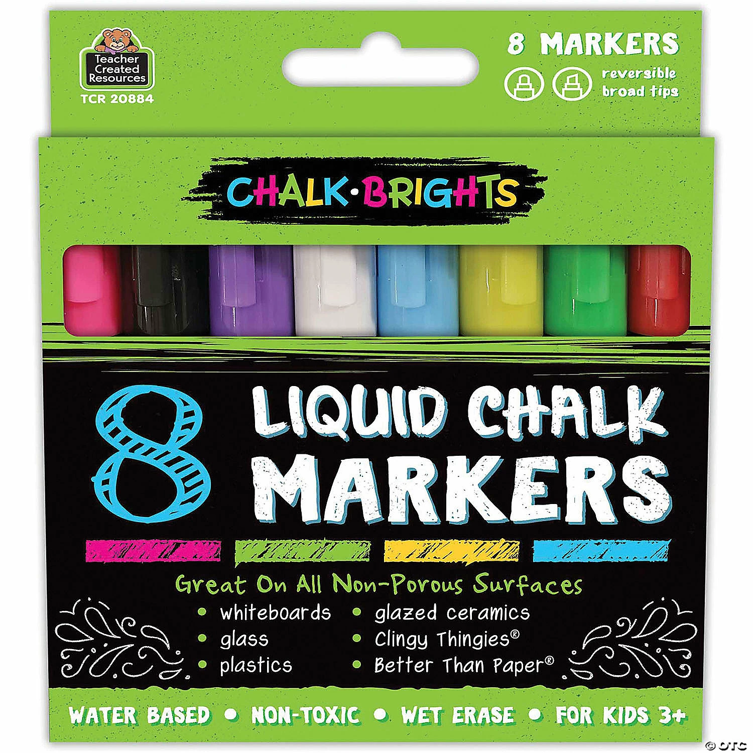 Chalk Brights Liquid Chalk Markers are broadline markers with reversible tips for either thick or thin lines. They are water based, non-toxic, and wet erase. Clean with water to easily change up your art! Great on all non-porous surfaces. Conforms to ASTM-D4236 &EN-71. Contains water, resin, and titanium dioxide (TiO2). Each pack includes 8 markers. For ages 3+. Sold as 2 packs of markers for a total of 16 markers. Special Shipping Information: This item ships separately from other items in your order. This item cannot ship to a P.O. Box. This item may be subject to additional processing days. ITEM IS NOT ELIGIBLE FOR EXPEDITED SHIPPING You may initiate a return for unused items within 30 days, if the items are in original packaging with all original materials included with the shipment.
