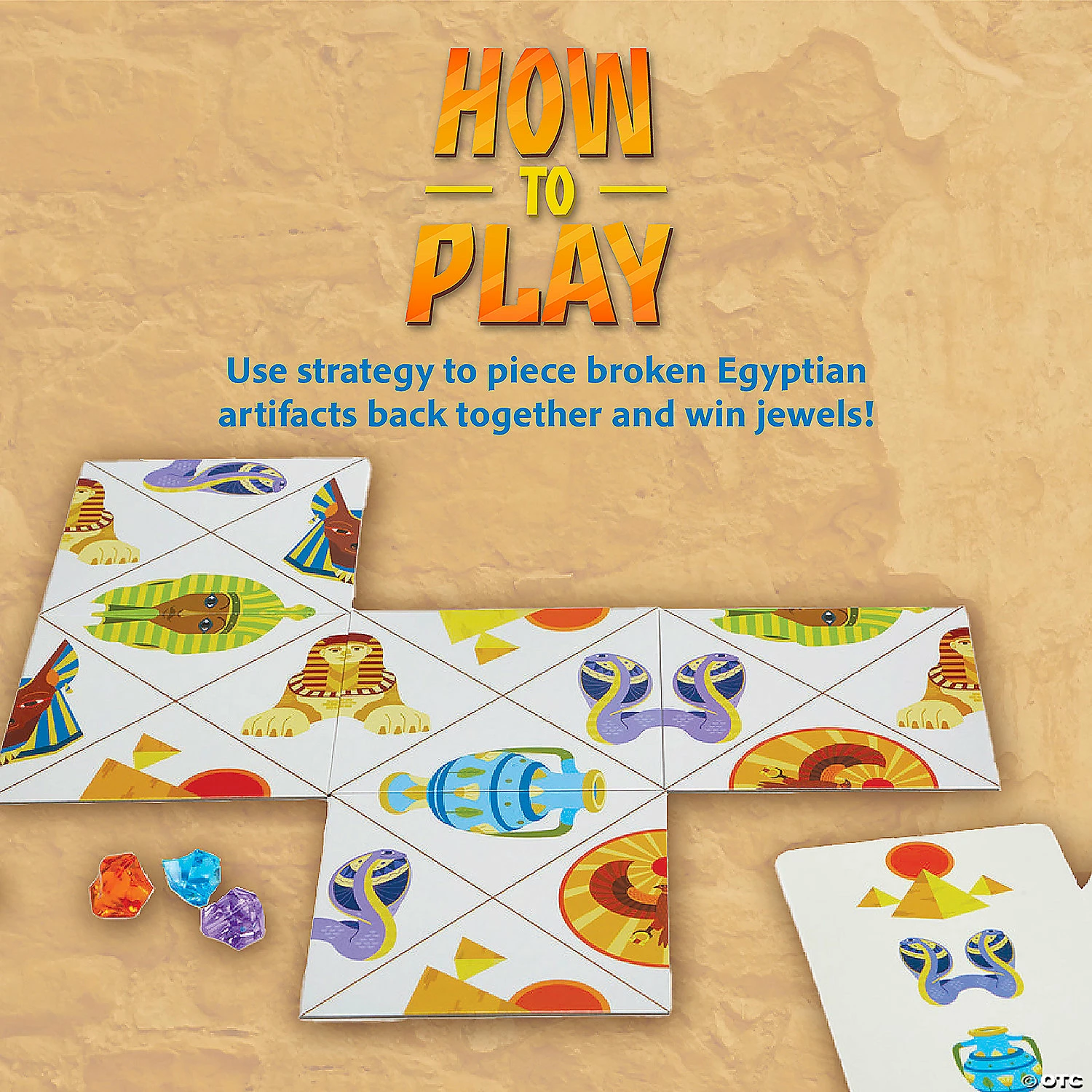 You’ve discovered an ancient pyramid in the shifting sands of Egypt. With strategy and a little luck, piece the broken Egyptian artifacts back together to win jewels in return. Only the explorer with the most jewels at the end of the game will truly triumph over the temple!• A matching game that sends you back in time• Players practice basic strategic thinking, spatial skills and matching skills• Easy and engaging for young kids and a fun play for older kids and adults• Includes 35 Artifact Tiles, 21 Quest Cards, 75 Temple Jewels, storage bag and rulesDownload Rules