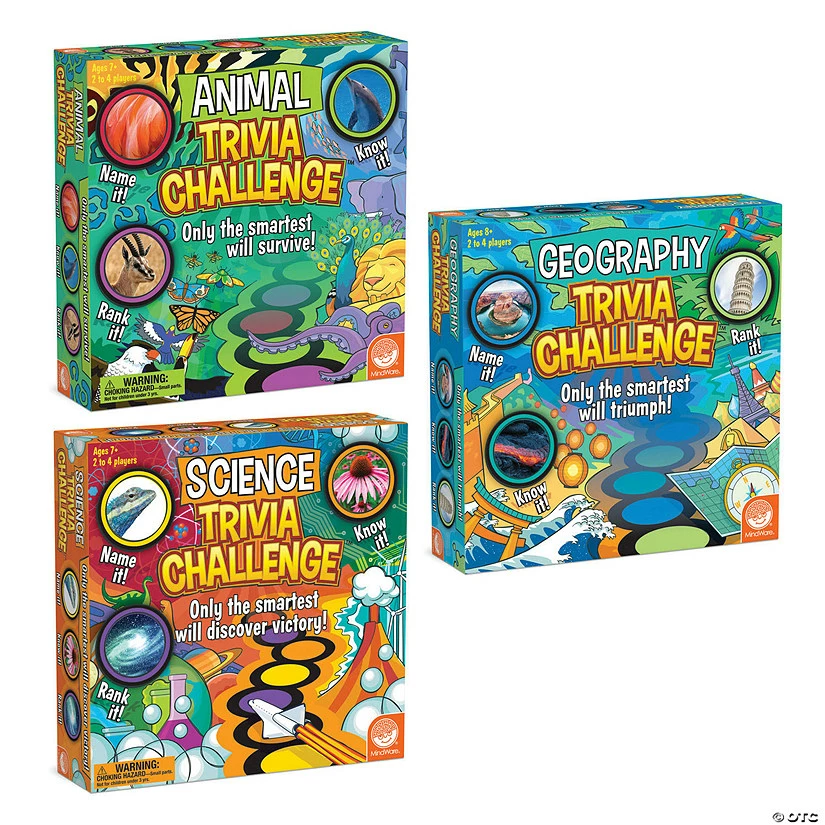 This ultimate trivia challenge trio is loads of fun! Each game is packed with 432 beginner to advanced questions including photo identification challenges for 2 to 4 players. In Animal Trivia Challenge, players test their animal knowledge as they travel the board-avoiding predators and pitfalls – answering questions and earning survival points. Fascinating reactions await when you play Science Trivia Challenge. Win big by avoiding setbacks and collecting observation tokens. Geography Trivia Challenge will elevate your game night and test the whole family on their knowledge of all things geography.• 2 to 4 players• Recommended for ages 8 and up